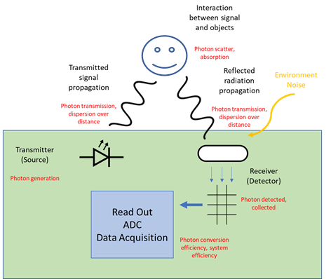 shows the “life” of photons for a ToF sensor and notionally where noise can occur. Red