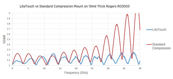 Figure 2: VSWR comparison against frequency between a standard compression connection and an Amphenol SV Microwave LiteTouch connector from 0GHz to 40GHz. (Source: Amphenol SV Microwave)