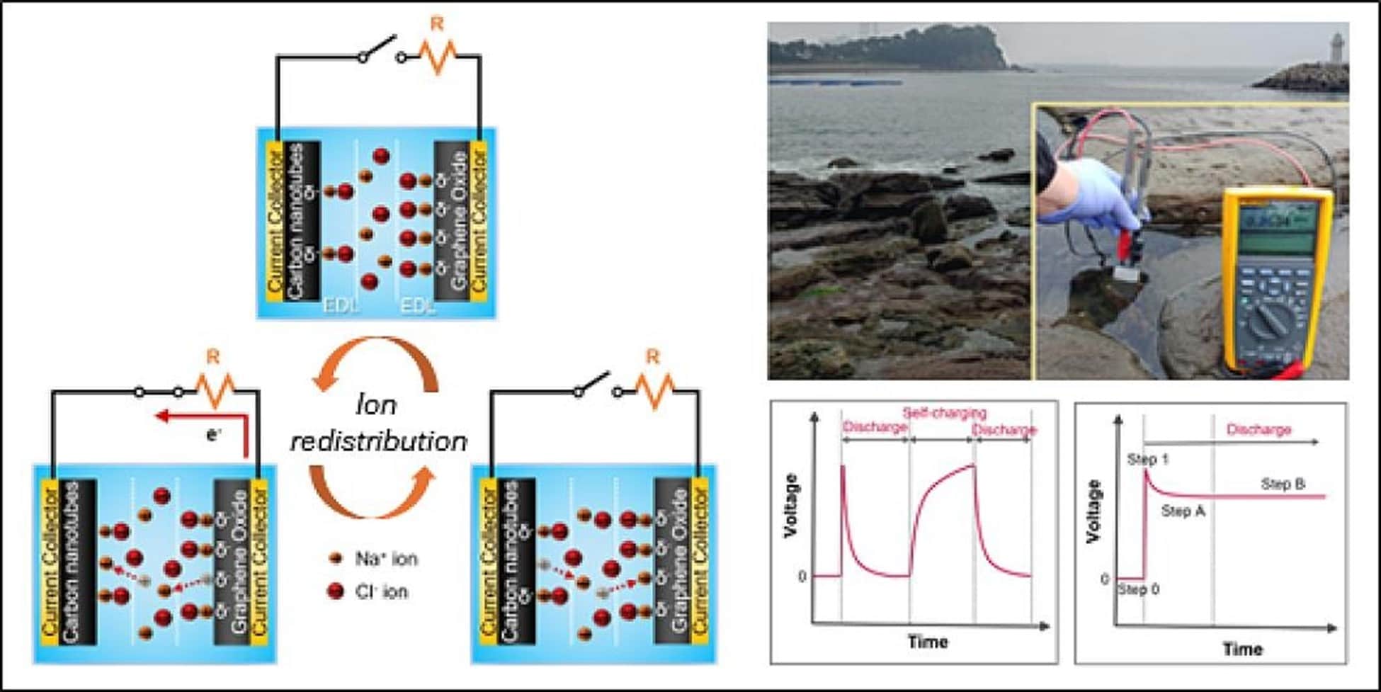 Seungmin Hyun explained the process: “The system can be reused even after being discharged by restoring its initial open circuit without external energy. There's an inherent oxygen functional group difference between two electrodes—carbon nanotube (CNT) electrode and graphene oxide (GO) electrode. When the circuit is opened, ions start rearranging following the electrostatic force between the ion and electrode. Since the GO electrode possesses much more oxygen functional group than the CNT electrode, more cations are attracted to the GO electrode than the CNT electrode. By that rearrangement of ions, surface energy difference between two electrodes is recovered, which means voltage is recovered.”[4]