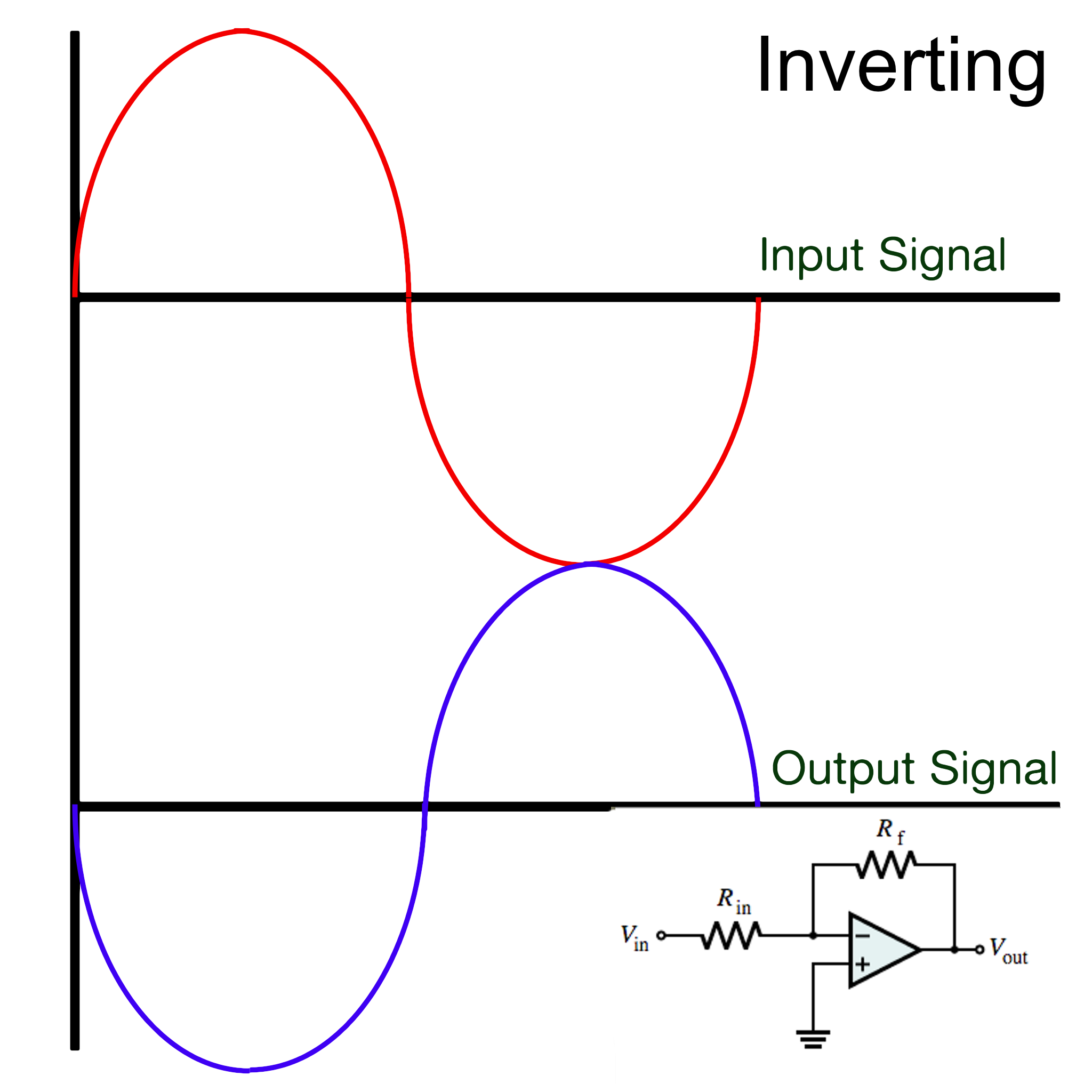 Two basic op amp configurations are known as “non-inverting amplifier” and “inverting amplifier”. The output of the non-inverting amplifier will remain in phase with the input signal, while the output of the inverting amplifier is 180-degrees out of phase. Both configurations take advantage of a design technique known as “negative feedback” which take the output signal and through a resistor network feeds it back into the inverting input. This is what allows amplification to occur. The non-inverting configuration feeds the input signal into the non-inverting (+) input of the op amp. Conversely, with an inverting configuration, the signal is fed in through the inverting (-) terminal.