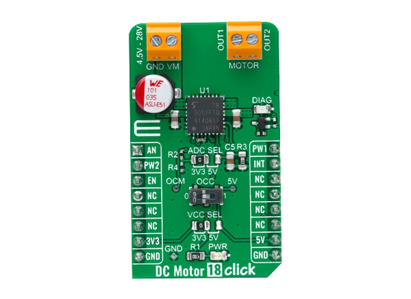 Mikroe DC Motor 18 Click features the Toshiba Semiconductor TB9051FTG automotive PWM-type single-channel H-Bridge DC brushed motor driver. The Forward/Reverse/Brake mode is selected according to PWM control signals. The motor operation and stop mode is chosen by an enable pin. It has a wide operating voltage range of 4.5V to 28V with an output current capacity of 5A max. It also features built-in protection against under-voltage, overcurrent, and overtemperature conditions.Features